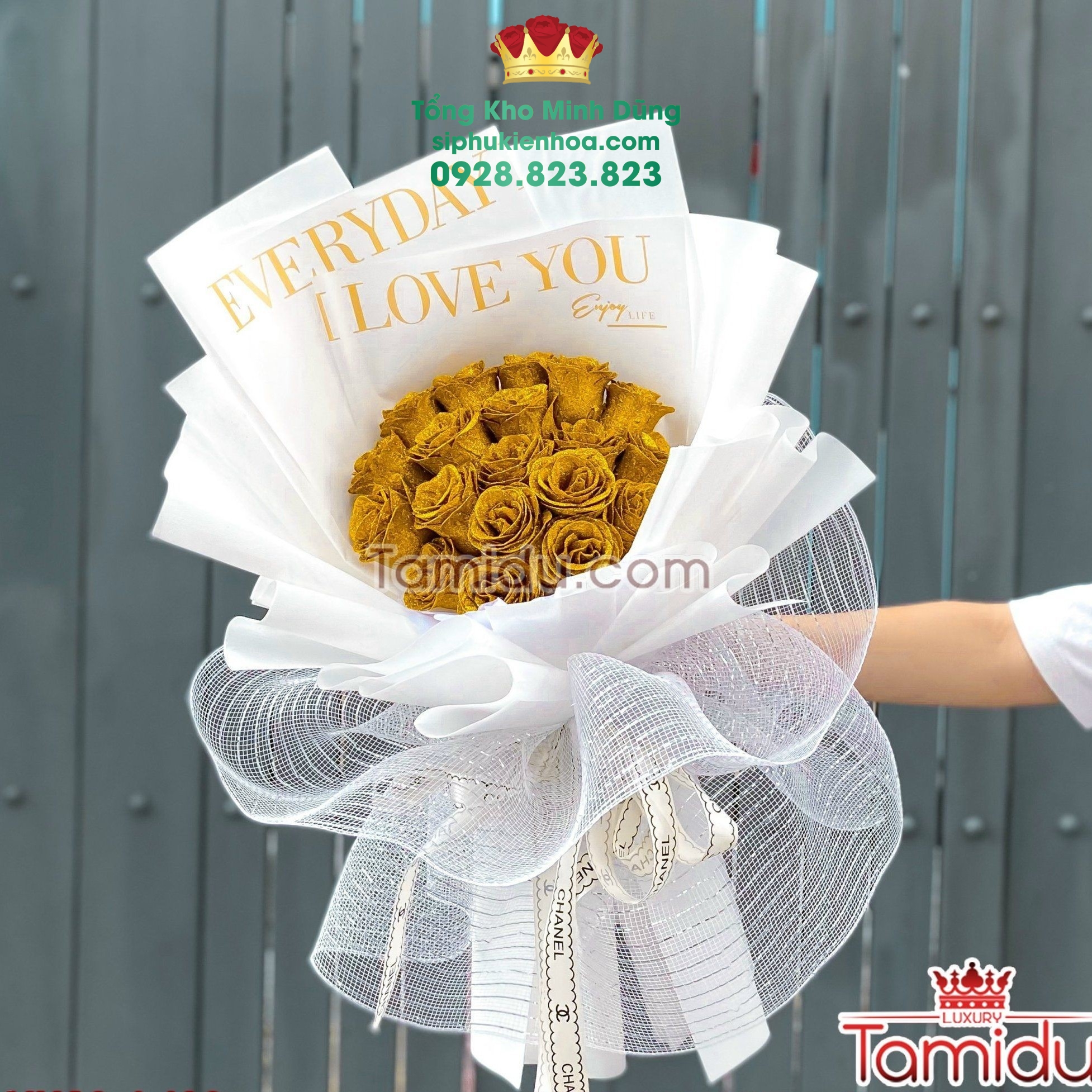 - Kết hợp với các phụ liệu khác như ruy băng, lụa cuộn, hoặc giấy gói hoa để tạo nên sản phẩm hoàn chỉnh.